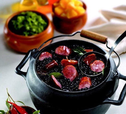 黑豆飯:巴西人的主食,巴西歷史上就是歐、亞、非移民薈萃之地,飲食習慣深受到葡萄牙、非洲、意大利、日本和土著巴西人的共同影響。真正具有本土淵源的菜肴除了烤肉外,可能就只有巴西豆飯了。黑豆飯(Feijoada)說是飯,其實和我們日常吃的大米飯決然不同。它的做法是由巴西黑豆加咸肉、香腸、豬蹄、豬口條、豬尾巴、豬耳朵、豬排骨、煙熏干肉,一同放入巴西泥鍋經小火燜燉而成,就著米飯、切成細條狀的甘蘭菜(Coure)、奶油木薯面(farinha)和切片的柳橙(Laranja)食用。