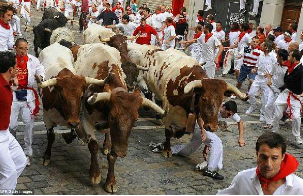 西班牙斗牛:西班牙奔牛節(jié),從每年的7月6日開始舉行,7月14日結束。地點在西班牙東北部潘普洛納城。在節(jié)日的9天里,來自世各地的人們穿上白衣褲,,纏上紅腰帶,表示參加的意愿。將6條經(jīng)過兩年專門馴養(yǎng)的公牛,突然從牛棚中放出,跟在一大群小伙子后面,狂奔亂竄,穿城而過。這些牛非常兇悍,有的牛角被磨尖,甚至露出神經(jīng),一觸即痛,有的牛眼睛被抹上辣椒,以激怒它,引發(fā)它的野性。