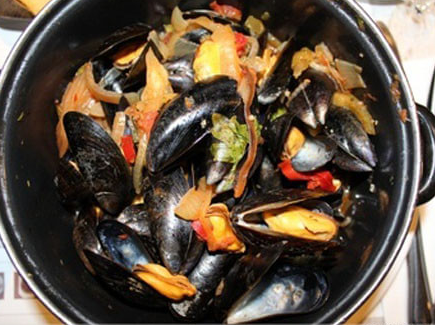 白酒蒸貝:比利時以各式海鮮貝類著名,盛產的貽貝,肥大口味佳,在各種的烹調方式中以白酒蒸貝最能品嘗其鮮美原味。來到布魯塞爾必不可錯過品嘗貽貝的機會。