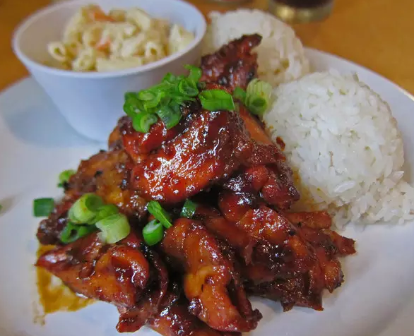 烤雞:這道夏威夷美食的起源于1995年,由太平洋禽類場的老板Ernest Morgado無意中做出的,他在一場大會上現(xiàn)場制做了一道烤雞,用的是母親平時在家里的做法,在烤雞途中翻了一次面。結(jié)果這道烤雞大受歡迎,Huli Huli Chicken就這么誕生了,在夏威夷語中, “Huli”即是“翻轉(zhuǎn)”的意思。風(fēng)靡之后,Ernest將他的烤雞醬汁申請了專利商標(biāo),不過很多人猜測醬汁是由番茄醬,醬油以及紅糖調(diào)制而成的。