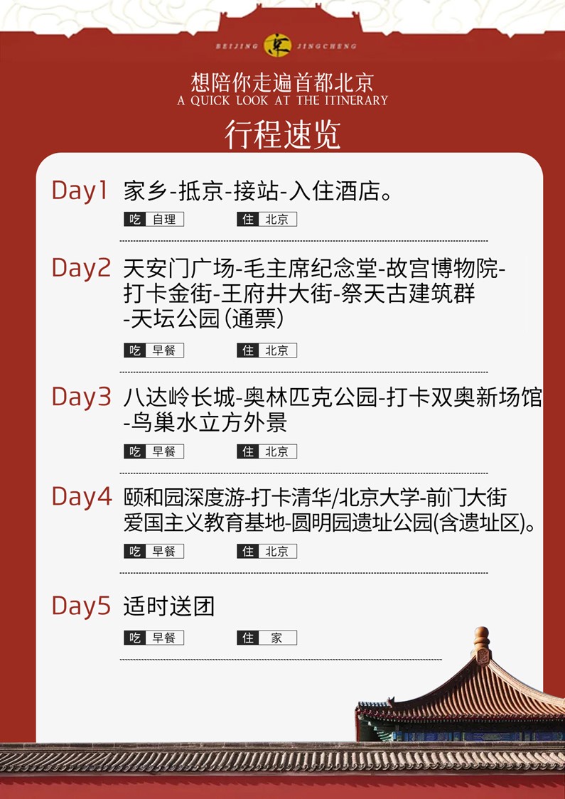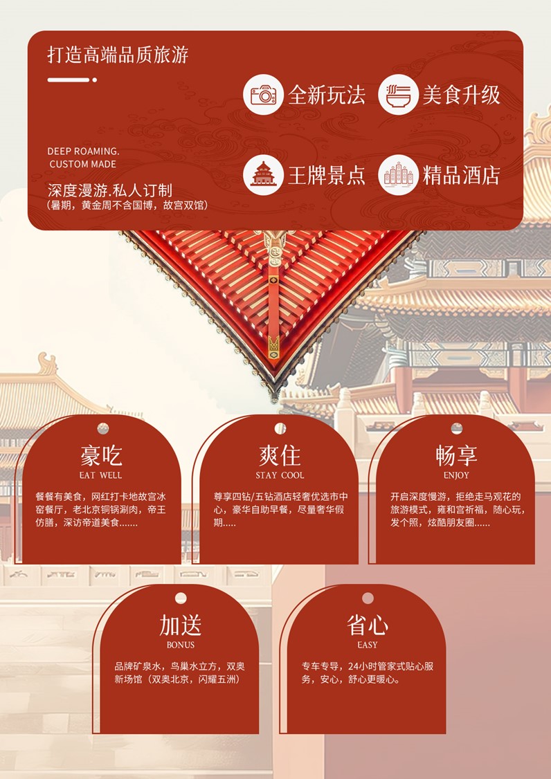 【皇家惠游】-北京品質5日游-不帶錢包游帝都 0自費O購物O景交 皇家惠游 O 購物 0 自費 0 景交 O 暗店 —漫游帝都,追憶冬奧精神…… 住的舒心:精選北京中... |