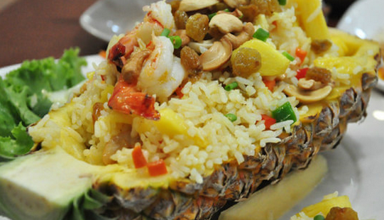 泰式菠蘿炒飯:泰式菠蘿炒飯運用泰國香米的香氣,搭配菠蘿以及什錦蔬菜等大火快炒,咸咸酸酸甜甜的口感,才吃一口就會讓人食欲大開,撘配腰果一起入口,口感層次豐富,相當值得推薦!尤其把飯裝在菠蘿里一起上桌,視覺效果奇佳!