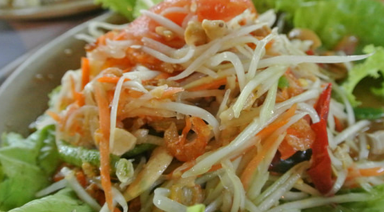 青木瓜沙拉:據北京旅行社了解,青木瓜沙拉是泰國人很喜歡的一道開胃小菜,入口酸、甜,隨后以辣椒帶出青木瓜的鮮脆口感,搭配生菜與花生顆粒的嚼感,讓人一吃就胃口大開。不過點這道菜時要記得,由于傳統的作法都會加上魚露、蝦醬與蒜頭,因此在點菜時只要特別注明這些東西不吃就行了。雖然少了蝦醬與魚露的調味,以辣椒取而代之的嗆辣口感,卻也讓清淡的開胃菜點綴出鮮活的靈魂。