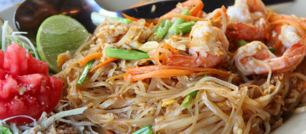 泰式炒河粉:這也可說是泰國菜里的招牌菜,先將河粉用甜醬炒得甜甜咸咸的的,之后在旁邊擺上碎花生、辣椒粉、花生粉以及豆芽菜等,要享用之前先把所有的料全部拌勻,再加上幾滴檸檬汁,入口后彈牙的河粉與青脆的豆芽,交錯出絕妙的口感,在花生粉的香氣中,檸檬汁更將整道菜的鮮甜滋味給緩緩帶出,最后出現的才是辣椒粉的勁道。通常這份料理在泰國比較常見,因此大餐廳小館子里都可以點得到!